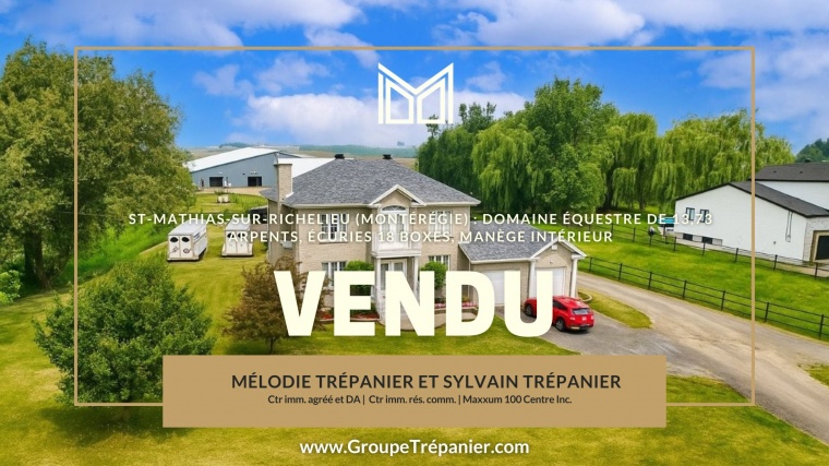 St-Mathias-sur-Richelieu (Montérégie) : À seulement 30 minutes de Montréal, ce magnifique domaine équestre de 18 boxes qui s’étend sur 13, 73 arpents vous offre une vue panoramique sur le Mont Saint-Hilaire, le Mont Saint-Bruno et Rougemont. Soigneusement entretenue et bien équipée, cette propriété saura séduire tant les passionnés de ...