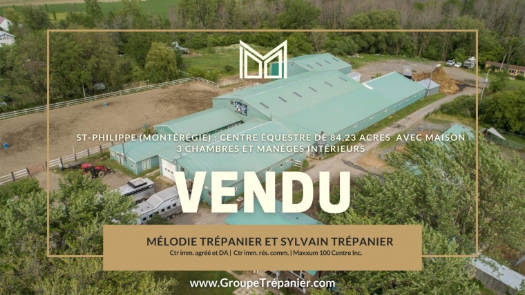 St-Philippe (Montérégie) : À seulement quelques minutes de Brossard et du Quartier DIX30, ce magnifique Centre équestre à vendre de 85, 46 acres (ou 101, 16 arpents) vous offre une opportunité unique d’acquérir une propriété parfaitement située pour accueillir votre clientèle. Le domaine comprend deux manèges intérieurs, une écurie avec ...